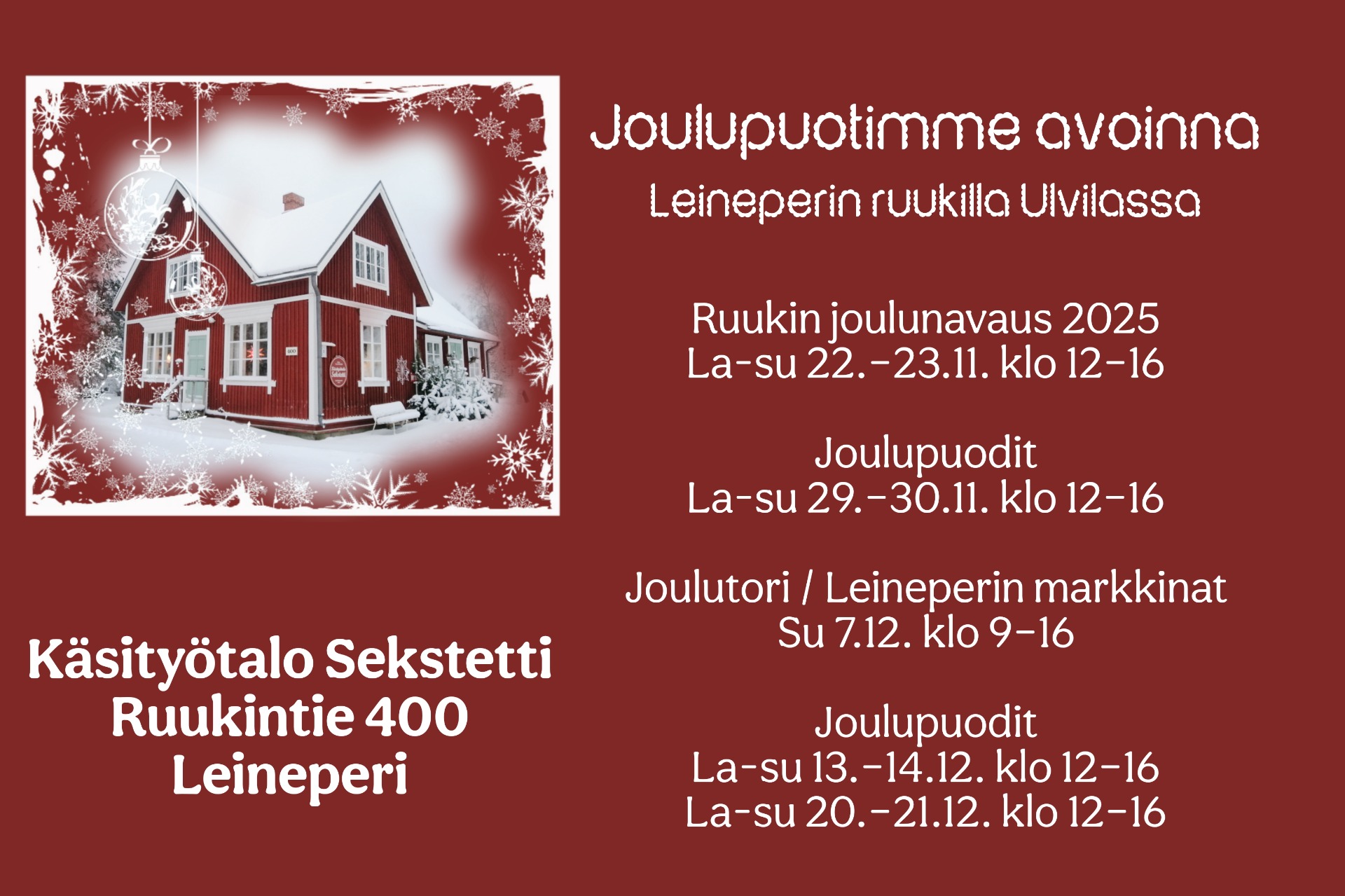 Käsityötalo Sekstetin joulupuoti palvelee Leineperin ruukilla viitenä viikonloppuna marras-joulukuussa 2025. Myös muut ruukin käsityöläismökit, info ja ravintola Leineperin Savipakari ovat avoinna.